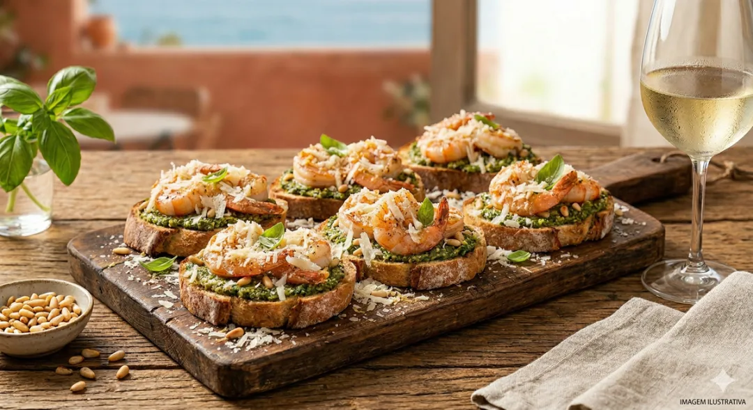 BRUSCHETTA DE CAMARÃO AO MOLHO DE PESTO GENOVESE