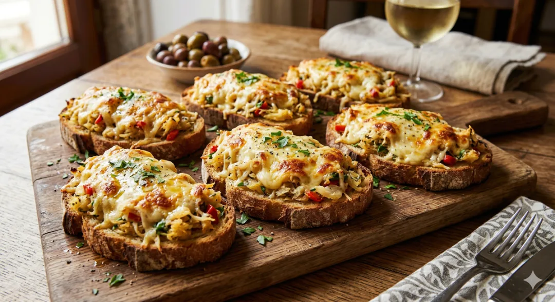 BRUSCHETTA DE BACALHAU COM QUEIJO GRATINADO