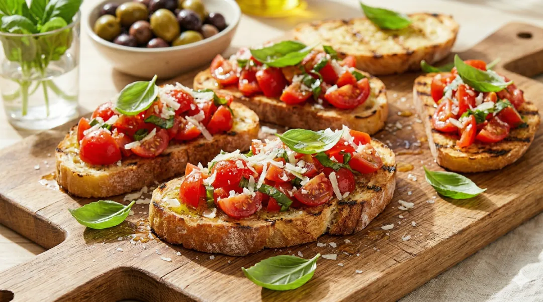 BRUSCHETTA DE TOMATE AO CHIERO DE MANJERIÇÃO